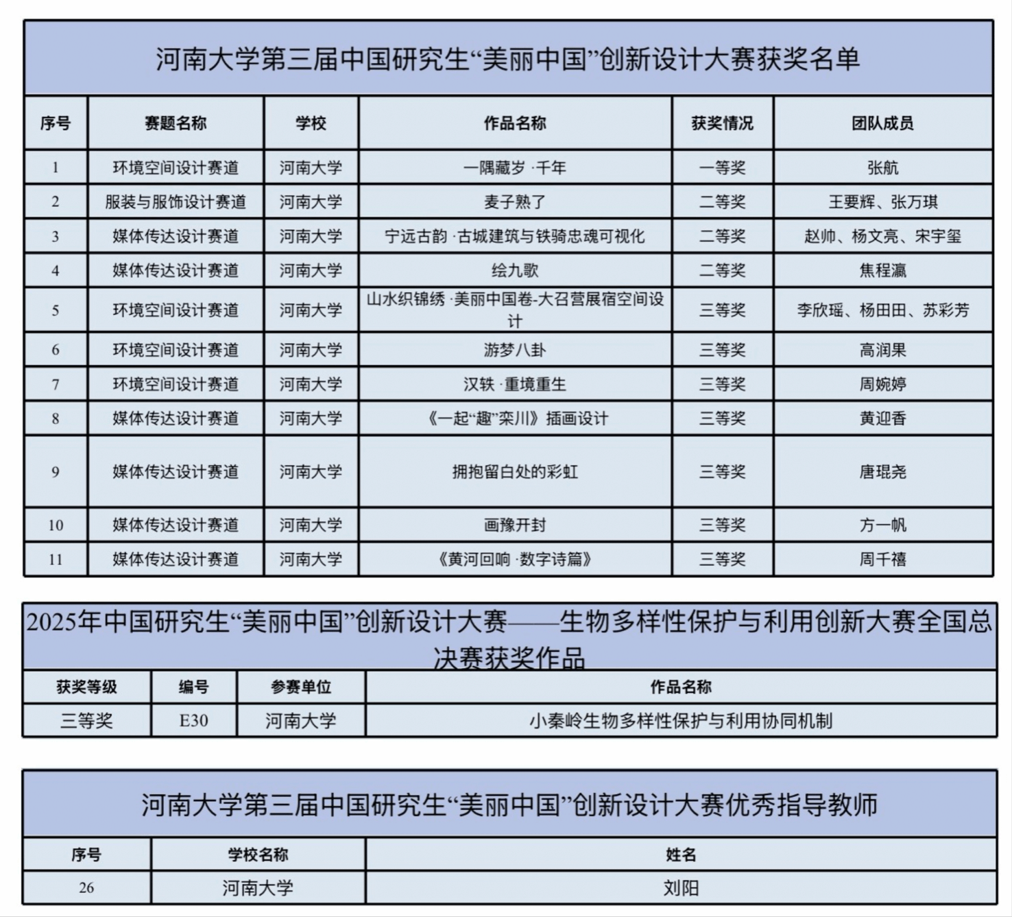 近日,第三届中国研究生“美丽中国”创新设计大赛全国总决赛,以及2025年中国研究生“美丽中国”创新设计大赛——生物多样性保护与利用创新大赛全国总决赛落下帷幕。在本届大赛中,河南大学研究生学子捷报频传,斩获全国总决赛一等奖1项、二等奖3项、三等奖8项;美术学院环境设计系系主任刘阳副教授荣获“优秀指导教师”称号。另外,河南大学研究生首度参加中国研究生“美丽中国”创新设计大赛——生物多样性保护与利用创新大赛即取得突破,参赛团队获得全国总决赛三等奖。
