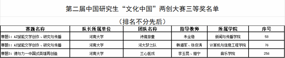 我校参赛队伍跨学科协同发力,精准契合不同赛道核心要求,各展所长,历经校赛、全国初赛层层筛选,最终3支队伍脱颖而出跻身全国总决赛,斩获全国三等奖3项,尽显河大研究生在文化创新领域的扎实素养和多元文化创新能力。这一成绩不仅是我校研究生培养质量的生动缩影,更充分彰显了研究生院在锚定育人目标、整合优质资源、深化文化育人与学科协同融合方面的扎实功底与卓越引领力,为研究生成长成才注入了强劲动力。
