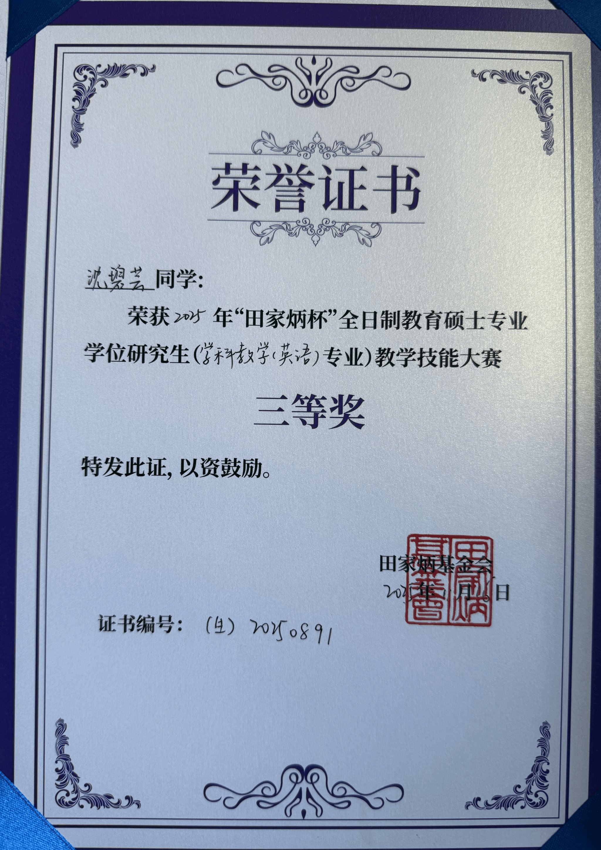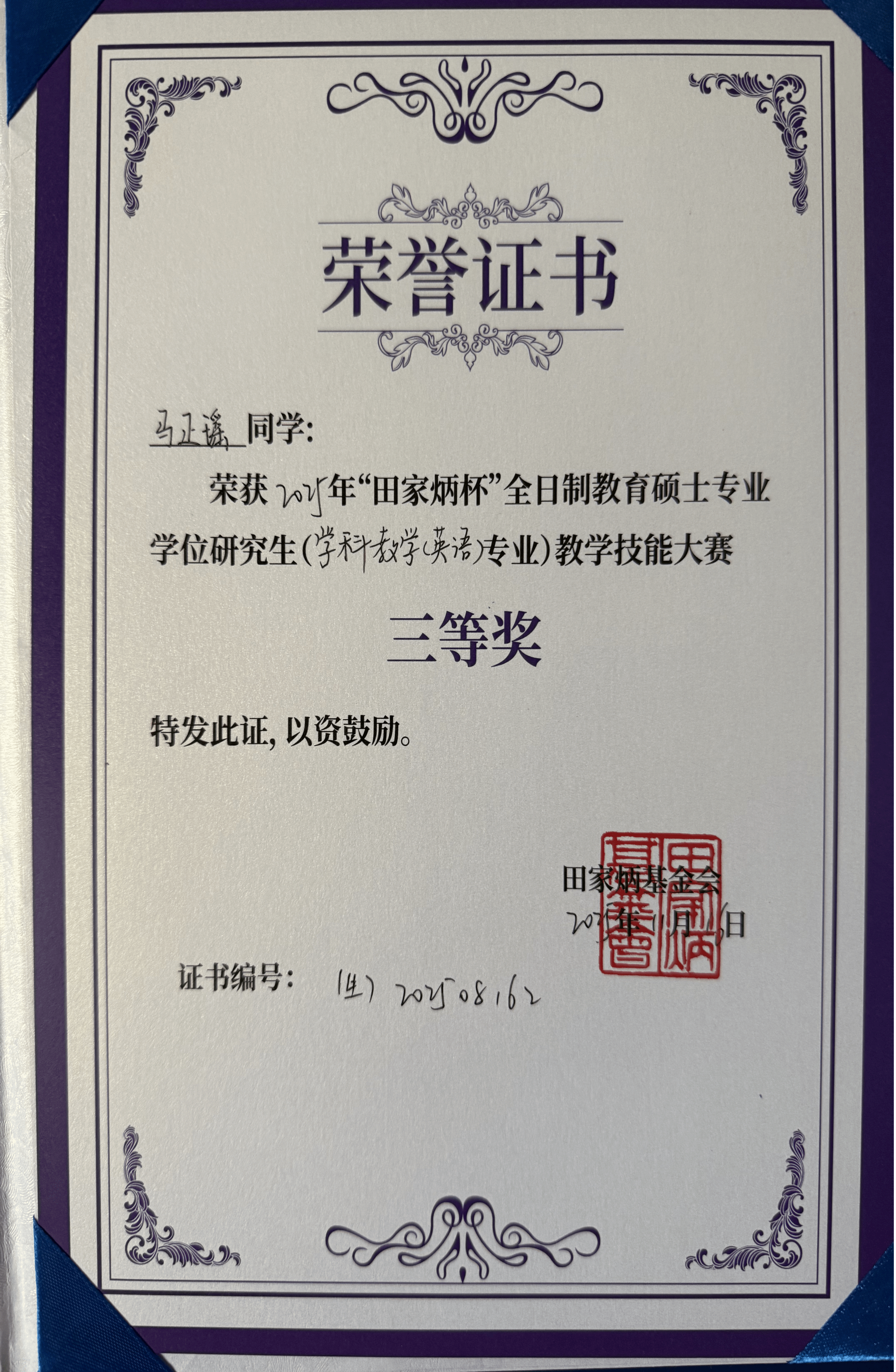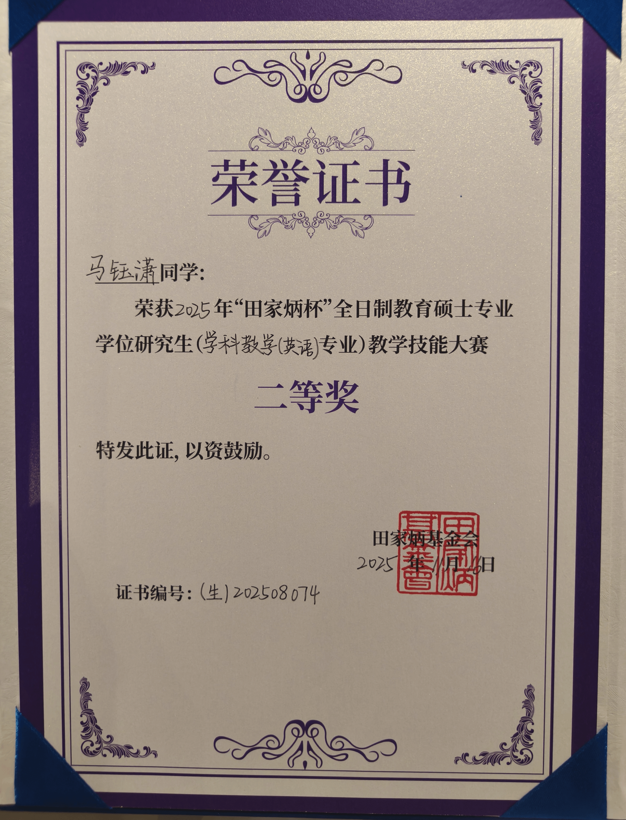河南大学外语学院(高级翻译学院)学子在此次赛事中表现亮眼,4名参赛同学凭借扎实的专业功底、精湛的教学技艺与从容的现场发挥,从众多选手中脱颖而出,斩获佳绩。2024级研究生马钰潇(指导教师:刘倩)荣获全国二等奖,2024级研究生沈碧芸(指导教师:马应聪)、汪思洋(指导教师:屈璟峰)、马正瑶(指导教师:陈晶晶)均荣获全国三等奖。这一成绩不仅是我院学子个人能力的有力证明,更实现了我院在该项国家级高水平赛事中的奖项新突破,充分彰显了我院学科教学(英语)专业人才培养的扎实成效与过硬质量。